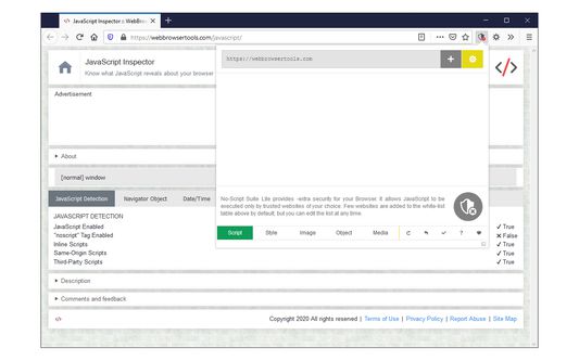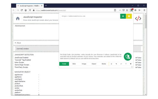 No-Script Suite Lite provides an extra security for your Firefox browser. It allows JavaScript (inline & external) to be executed only by trusted websites of your choice. Some websites are added to the white-list by default, but you can add or remove items at any time.