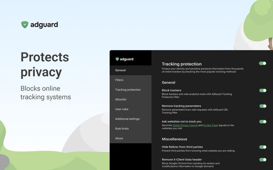 Just enable Tracking Protection filter in AdGuard settings. It completely removes all forms of tracking from the Internet. AdGuard has one of the largest tracker filters containing more than 5,000 rules.