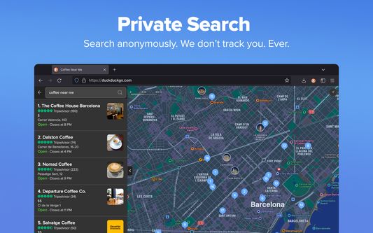 At DuckDuckGo, we believe the best way to protect your personal information from hackers, scammers, and privacy-invasive companies is to stop it from being collected at all. That's why millions of people choose DuckDuckGo over other browser extensions to protect their searching and browsing. Our built-in search engine is like Google but never tracks your searches. And our browsing protections, such as ad tracker blocking and cookie blocking, help stop other companies from collecting your data. Oh, and our browser extension is free — we make money from privacy-respecting search ads, not by exploiting your data. Take back control of your personal information with the browser extension designed for data protection.