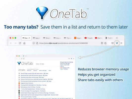 OneTab - Too many tabs? Convert tabs to a list and reduce browser memory
