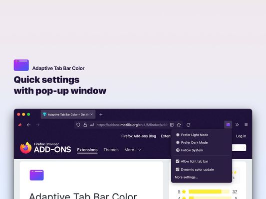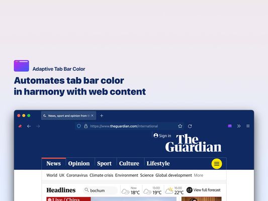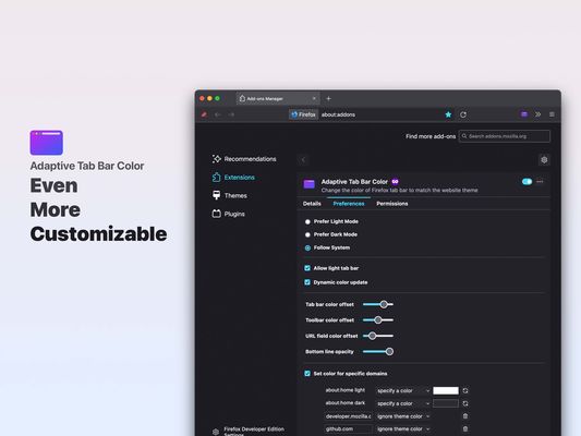 While you browse the web, this add-on changes the theme of Firefox to match the appearance of the website you are viewing — just like how macOS Safari tints its tab bar.