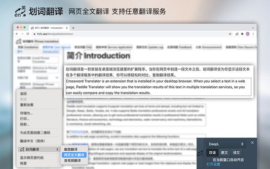 一站式划词 / 截图 / 网页全文 / 音视频 AI 翻译扩展,支持谷歌、DeepL、ChatGPT、百度等 9 个国内外主流翻译服务,均可用于全文翻译。能在 PDF 里使用。支持辅助键、快捷键、悬浮取词。