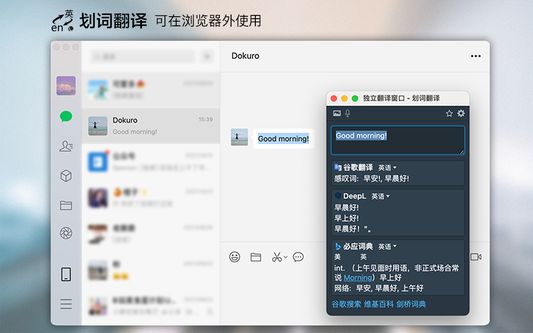 - 内置独立翻译窗口,用于翻译浏览器外的文本。可以勾选持续监听剪切板,在任意程序复制文本即可自动弹出并翻译。